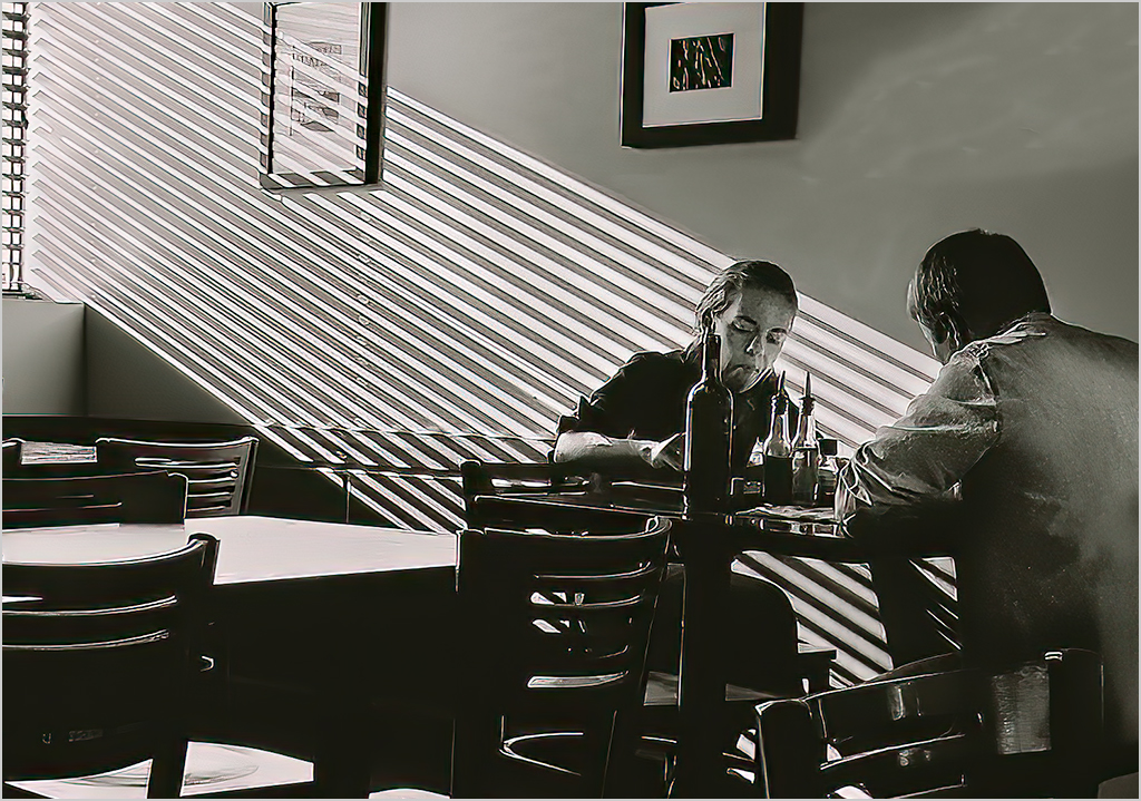 Wonderfully seen Black and white definitely the right choice I would crop in even more The light beams on the couple is the main event I agree with reducing the brightness of the beams I tried this see image |