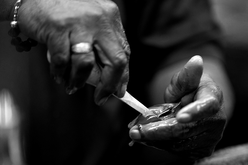 I loved the frame that you have shared. Eventough you focused the main subject, I thought to keep more room to give details about the right hand that holding the knife. I just wanted the viewers to see the details of the hand that doing the cutting or in other words shucking.