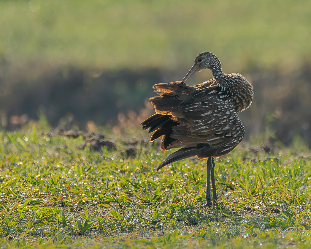 I like this photo of Limpkin with its soft background and the light coming through the end of its wings. The perfectly round dew drops are really interesting. When I see the image in full screen I see a blue halo around the grass blades and the dew drops that could be removed by chromatic aberration in LR.
