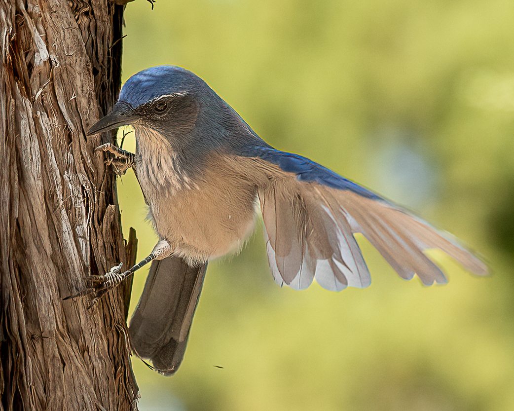Hi Mike, I really like the composition and the beautifully blurred background in this photo. I also like the blurred wings because it shows motion. My eyes go from the wings, to the focussed look and then the powerful grip on the tree. You have done a great job in capturing the Jay in action. I agree with Kathy that the image is slightly soft so I took the liberty of passing it through Topaz Deniose. That really sharpened the image removed some of the noise that you see on the bird. What do you think? |