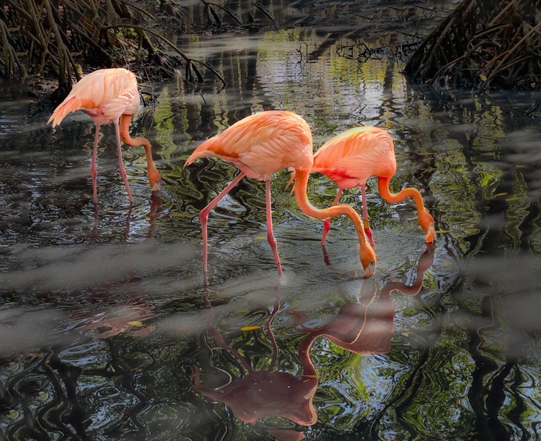 Adrian, What a cool capture from what sounds like a fabulous aviary. I am wondering if perhaps a bit more space to the left and a bit less space on the right might be a useful edit. I also like a mysterious look, so I played around with your image to try to focus more on the birds yet bring out a bit of the mysterious atmosphere. I re-cropped it in PS, using content aware to fill in the left side, and then I took it back into Lightroom and darkened and softened the background to give the flamingos more emphasis while trying to create a mysterious background. |