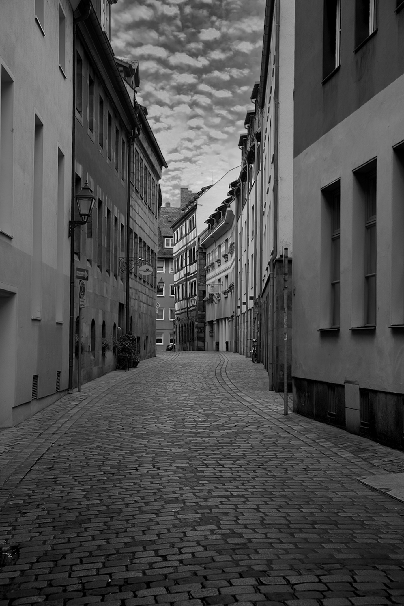Well, I guess that being late to the game makes it harder to kick a field goal from my 10 yard line. Like most, the street is missing people or animal subjects. I do think that my "Bob Sky" would have clouds that have white and texture to go with the street than your choice, sooo. Sky replacement in Ps, I used the Red curve in LrC B&W on buildings and graduated filter on the street. Here goes my long shot kick.