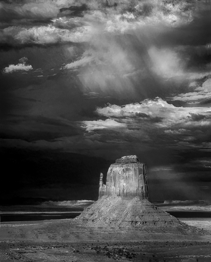 Because the blue in the storm clouds and red in the mesa actually convert to a similar tonality, perhaps altering the underlying color-tones to create a difference and then amplifying the sense of dimensionality by working the dark tones against the lighter tones might get back to the sense of depth and storm we get from the original color version. |