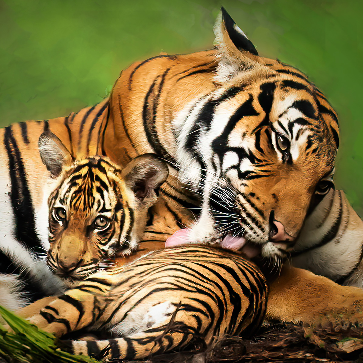 You captured a beautiful moment with the mother tiger cleaning her cub. Your post processing to bring out the warm colors is excellent. You could have cloned out the chain-link fence more thoroughly. And, when lightening the cub's face, it would have been better to feather the edges. I edited your image with these changes and also cropped it a little to focus primarily on the mother-to-cub interaction, and I cloned out some of the distracting grasses. A lovely shot! |