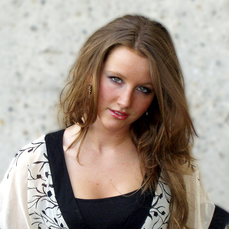 A pleasing portrait with simple black and white tones that allow the colors of the model's skin tones, eyes, lips and hair to stand out. The eyes appear sharp and in good focus. Having her head tilted gives the pose some interest. The texture in the wall is a little distracting though. Perhaps making a selection of the model in Photoshop and adding a some Gaussian blur to the wall might make her stand out. I took the liberty to make these changes and cropped the image a little to emphasize the model's face.