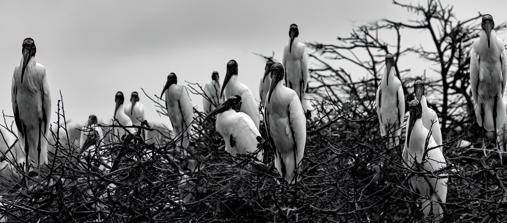 This is a great photo! The storks do look like soldiers at attention, and the image has a unique and eerie feeling about it. Your darkening and converting to B&W just made the image come to life. Even the plain gray sky adds to the mood. If I were to suggest any changes, it would be to clone out the storks lying down. They seem to distract from the standing birds. I took the liberty to use Photoshop to clone in the surrounding branches at about 50% opacity. The title should definitely be, "Soldiers." |
