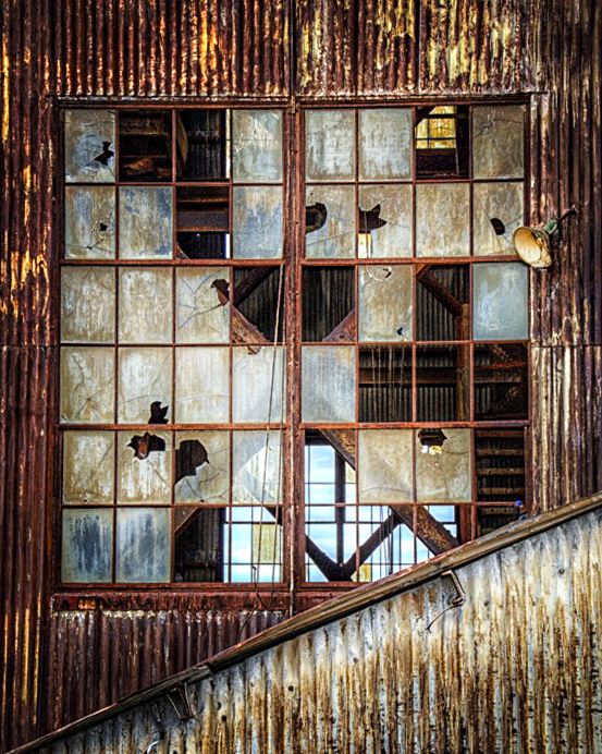 While the rest of us are shooting pretty flowers, Cindy is shooting grunge! :-) I am also a fan of rust and decay, and this image has it all. The blue and orange tones provide nice complementary colors. I like your cropping such that the diagonal line runs through the corner. If I were to make any suggestions, it might be to crop a little more off the right and top. It will put more emphasis on the windows. |