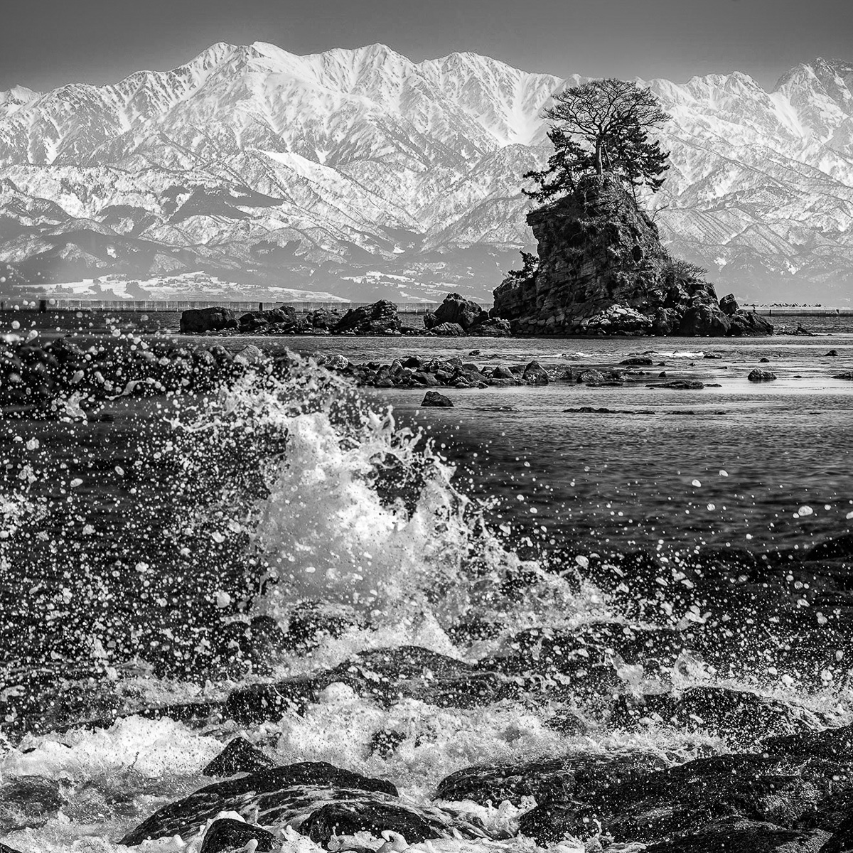 As I was browsing through this month's images in all the study groups, your image caught my attention...again. I do prefer the color version because it reminds me of a Hokusai print. The crashing wave in the foreground is amazing. However, the B&W version is also a strong image. The contrasting power of the crashing wave against the serene background evokes a strong emotion inside me. I thought the image would show this contrast better if it were cropped to a square format, eliminating some of the sky and the large rocks in the foreground (which pulls my eye from the crashing wave). I added contrast to the image (maybe a little too much on second thought). I also darkened the sky to frame the mountains. |
