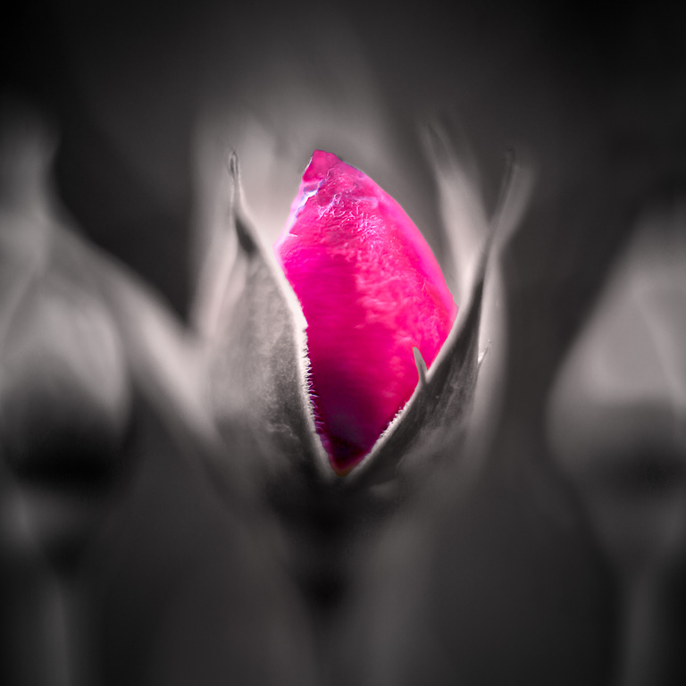 Nice selection of the iris bud. Iris buds are quite fascinating, and the conversion of everything but the bud allows one to concentrate on the bud's colors and texture. I might suggest cropping off the top of the petal behind the bud. I don't think it's important to see the entire petal, and it draws my eye away from the bud. |