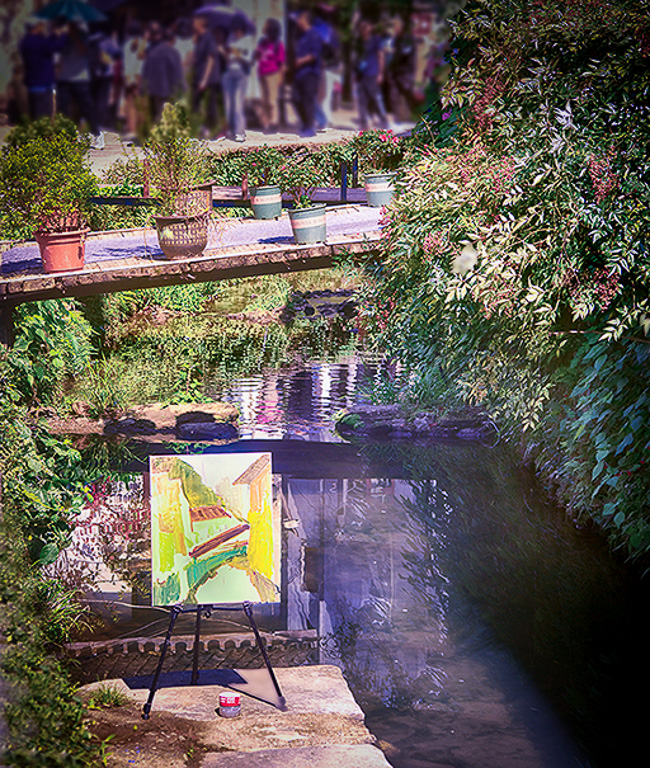 This is a pleasant scene with the small stream and the artist's painting-in-progress of it. The group of tourists in the background is quite bothersome though as well as the yellowish cast. Maybe darkening the people and removing the yellowish cast would help improve the image. |