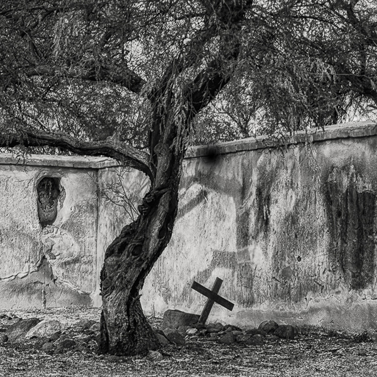 What I find to be the most interesting features in this image are the tree trunk and cross and how they contrast with the bright wall behind them. Converting to B&W brings out the contrast more. What bothers me is all of the bright wall to the left where there is nothing of interest. I would suggest cropping that portion out. |
