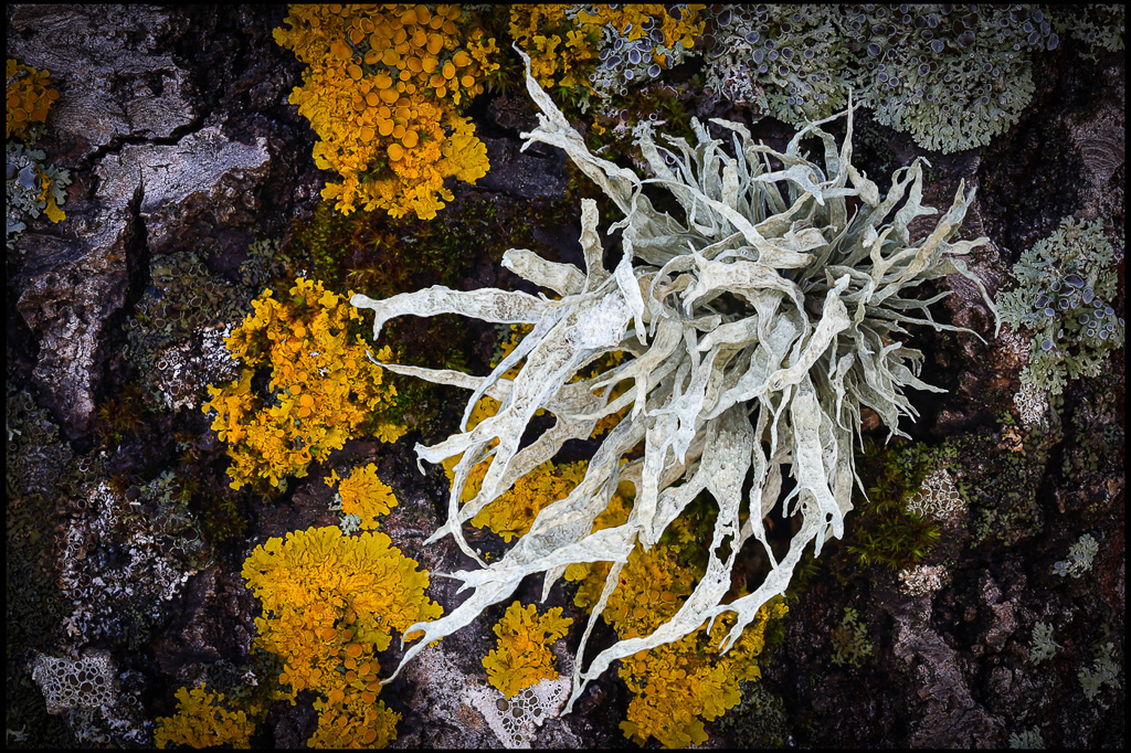 You captured this group of lichens in exquisite detail from front to back. My only suggestion might be to add a vignette to focus attention on the white and yellow lichens in the center. I hope you don't mind my playing with your image. |