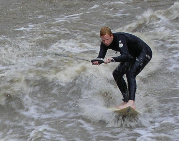 I wasn't thinking waterfall style slow shutter... just enough to show some movement, along the lines of the attached photo that I grabbed when I saw a group "surfing" in a flooded stormwater drain, using a waterskiing rope to prevent themselves being washed downstream. I think the 1/40 sec exposure gives enough movement to give a sense of the water movement without being milky soft (sorry - it's not a very good image technically - cropped from a frame with a 2 megapixel point-and-shoot that I carried around in my bicycle a decade or so ago). |