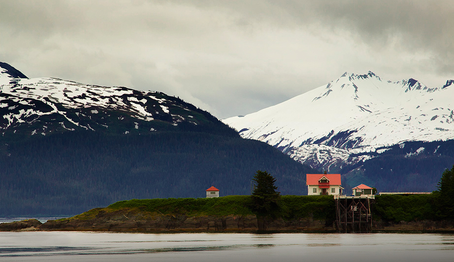 As presented, the sky and snowy mountain, the house, and the lighthouse each competes for attention. If it were mine, here's what I would do. Crop as I suggested, and darken the water slightly. Then flip it and remove the attraction of the lighthouse, while darkening the outbuilding a bit. This doesn't change the majesty that attracted you, nor the comparison of man's handiwork with nature's, but the eye stays in the frame and all lines lead to that red roof. (On the other hand, that wouldn't go in Phototravel.)