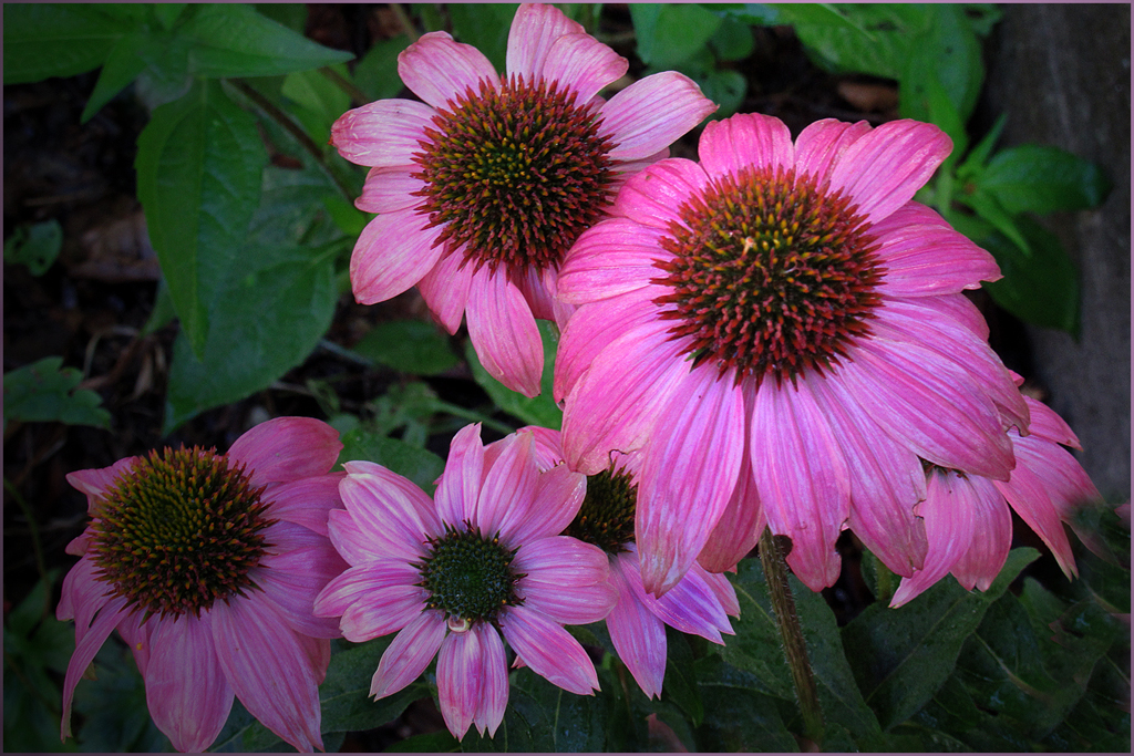 With sharp flowers and wonderful colors and a good composition of the flowers, this is one is a keeper. To my eye, the background is too prominent and a bit distracting in part because of its bright colors. If it were mine, I would darken the edges, including the loser flowers and particularly the leaves, to emphasize the big flower and unify the composition. I think it "reads" better if it is reversed, and reversing further helps to de-emphasize the leaves.
