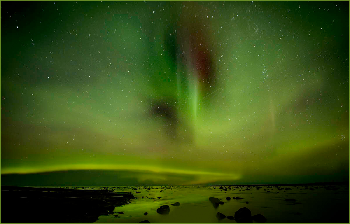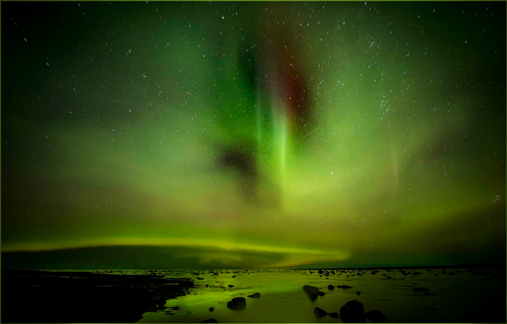 I suggest two changes, one important (to me anyway,) and one with importance that depends on how and where you show it. If it were mine, I would tone down the bright, curving line, because t takes away from both the reflections and the auroral hole and pillar that is the most interesting part of your picture. The other one is a that a thin possibly greenish border would probably spiff up the image by separating it from the black background; otherwise in this case the image looks lonely in a huge black background.