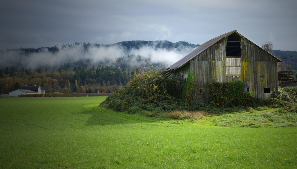 A peaceful scene well captured! The colors make this image, and every bit of the image is needed; I wouldn't change any of the cropping. While you need all of it, the barn is clearly your picture, and it is a bit drab. I think it helps a lot if you do something like this: Select the face of the barn, I used the polygonal lasso, then did a small feather followed by increase in brightness and contrast (now of the barn alone.) Then I darkened around the edges with a light circular gradient, and brightened things up a bit. Does this help?