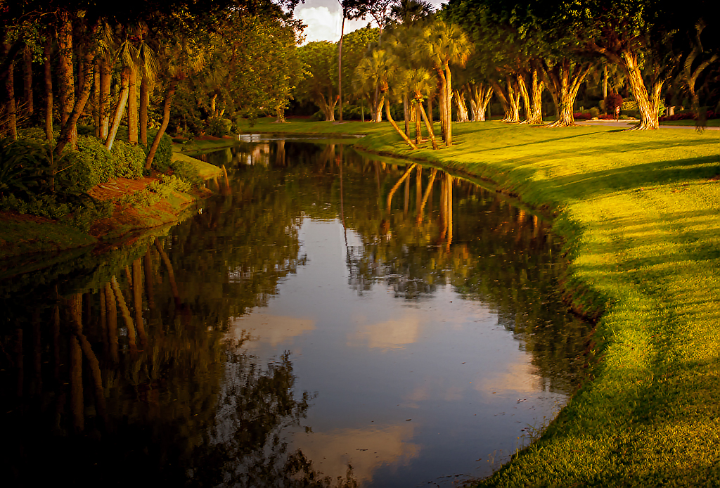 This clearly shows a peaceful time of day with good colors and an interesting composition. To me the interesting part of the picture is the trees at the upper right, but my eye has to jump over the brightness of the pond to get there -- which really says "divided interest." You can unify it by something like this thumbnail. It's the brightness of the pond and its lack of interesting detail that's a problem for me. I simply ran a linear black gradient from the lower left to the upper right to tone down the pond. Now it seems to me to have only one center of interest.