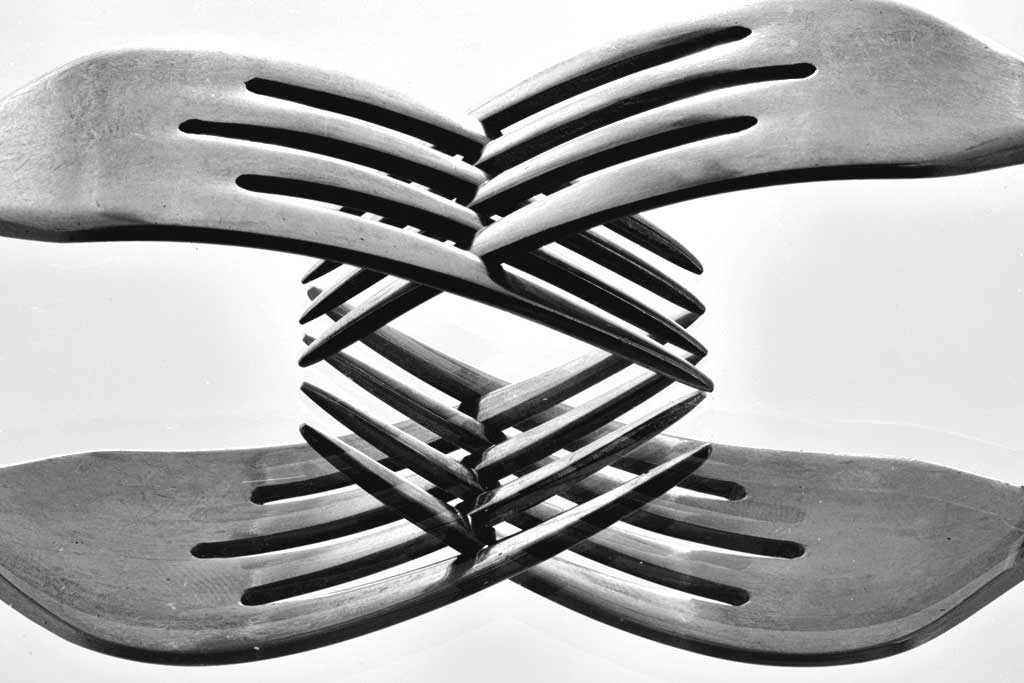 This is a strong, clean, simple design. I would never have guessed how it was done. The repetition in the pattern is one of the pest parts. I suggest two things. The first is to include the rest of the top right fork that is missing; if it isn't in any file, it will be easier than you may think to fake it. The second has to do with brightness and contrast. Your image has no real whites, and only moderately strong blacks, and therefore is overall gray. I used both Brightness and Contrast and Levels (in PS) to give it some more effective contrast. (Almost) all monochromes need some real black and some real white.