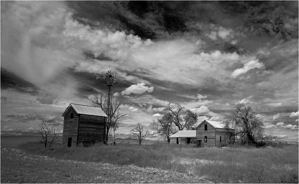 You have a beautiful story-telling picture. You did just right to make this a monochrome; this is what monochrome is for. I wish it weren't so gray, though. Monochrome, especially, needs the full range of tones from real black (000) to real white (255;) your histogram is centered, but doesn't reach either end. The image is therefore gray, almost by definition. To illustrate, I used Levels in PS to set the black point and white point, Curves to boost the shadows; a long, black and opacity-adjusted gradient centered on the peak of the roof of the house to cool down the sky and make the house stand out, and then brightened and increased contrast.