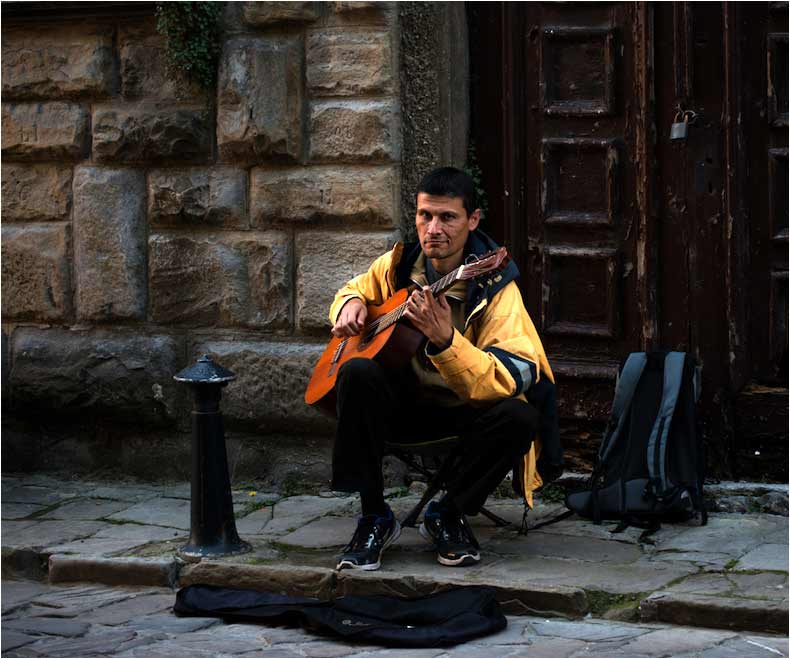 That fine old door is an important part of your image, but not important enough to take up as much space by itself as your musician does. I wish you had taken a few steps to your left before taking the image, though. That would have put the door behind him, and given a better composition by cropping off unneeded space.