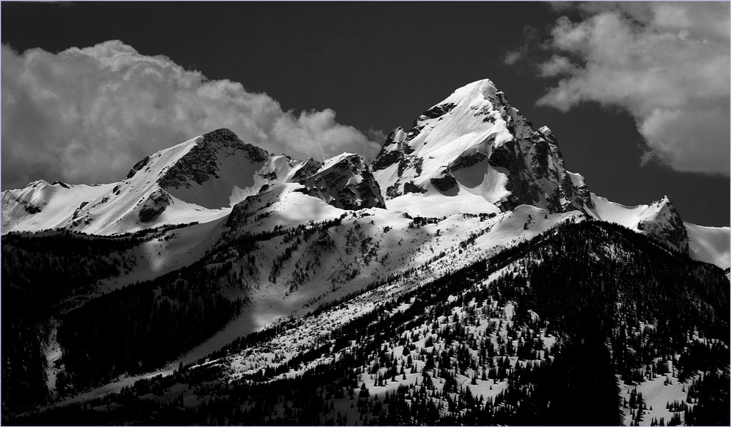 Our advantage is that we live only an hour or so from the Tetons, and can access them almost any time and any weather. We find that the better times are usually at sunrise (usually the only times they are really cross-lighted in good light,) in mid-morning, as in this image, and in stormy weather.