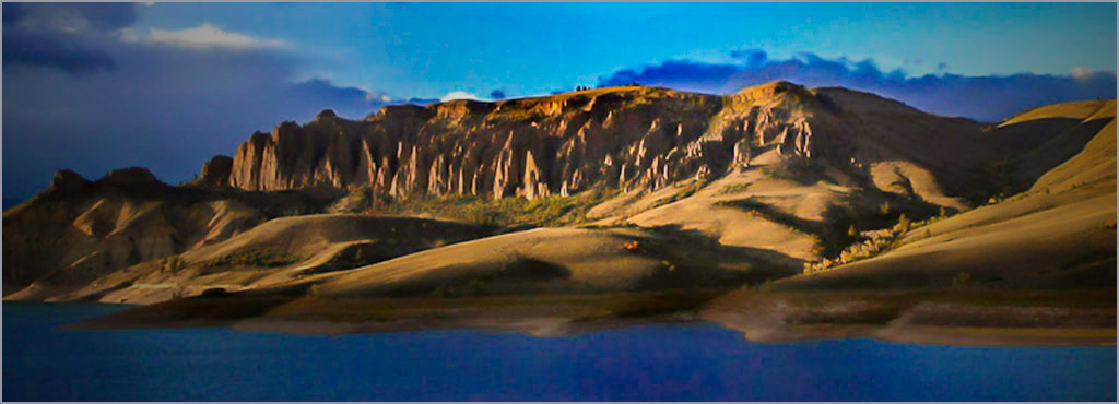 Your arrangement of the elements of the image is excellent, as are the colors, and cropping is very good. I hope I don't sound like a hack club judge, but to me it lacks a real center of interest; fortunately, you have one easily available. I suggest that you darken progressively from the big bump on the right of the cliffs in both directions, so that the bump stands out because it is brighter. I tried to do something about the softness, but wasn't able to do so. You did overdo the noise compensation. In Photoshop I use the sequence Filter>Sharpen>Smart Sharpen as he last thing in post processing, and usually get good results.