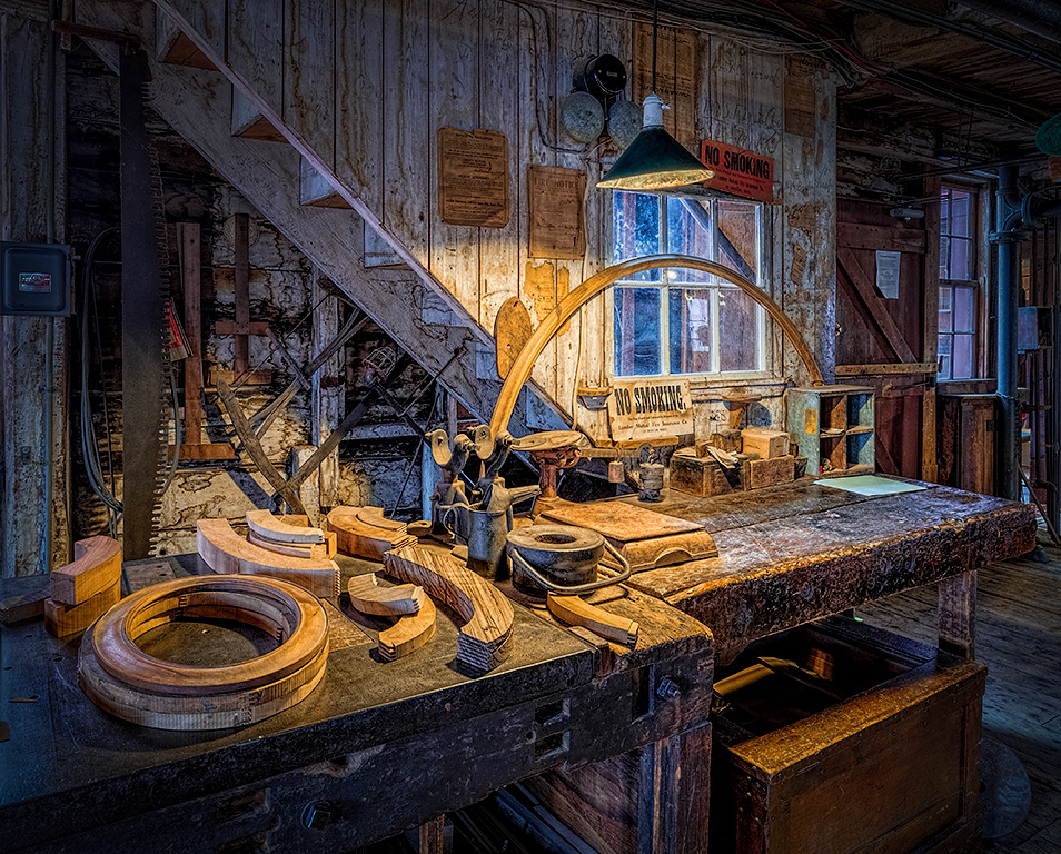I like the overall composition and feel of this image. It's organized chaos. That circular element in the foreground grabs your attention. Although the incandescent lamp is lighting the area beyond, I would be very tempted to enhance the mood of the lighting with some selective burning and dodging in Photoshop. Particularly the area on the right side. It's secondary to the scene. The color and texture work well. I took liberty of adding some edge darkening and added dodging. |