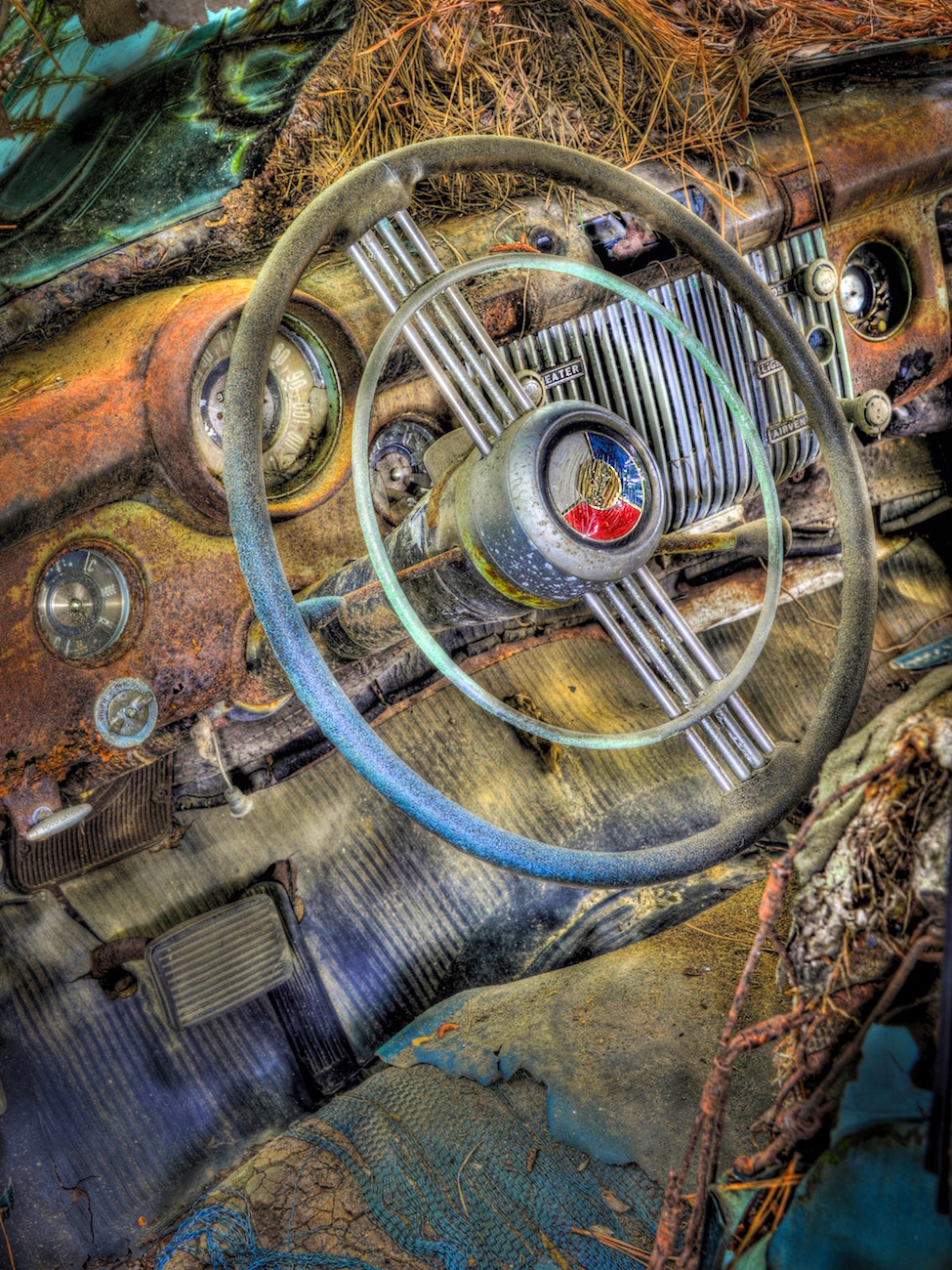 I have been to Old Car City twice. My first trip was a two day adventure. These are the type of scenes where one can go wild with the Grunge. I made two quick adjustments to your image to make it pop. 1. Camera Raw Filter, Click Auto. 2. Added vignette in effects. I added mor than the usual to bring the viewers attention to the steering wheel. |