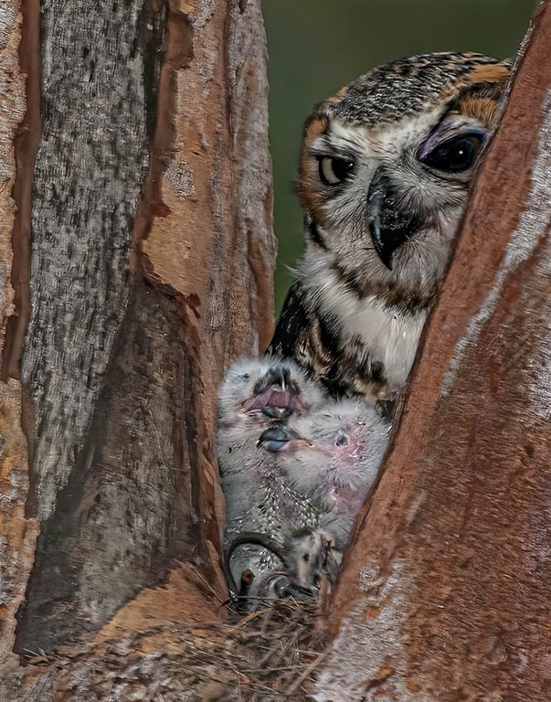 You have an interesting capture of the momma and babies. Your processing has worked well for you. I was recently working with Erik on an image with some birds that had their eyes white because of an extended flash. In the Adobe Raw Filter is a Red Eye removal tool. If you look closely, you'll find a "Pet Eye" removal tool. See the results in the attached image. |