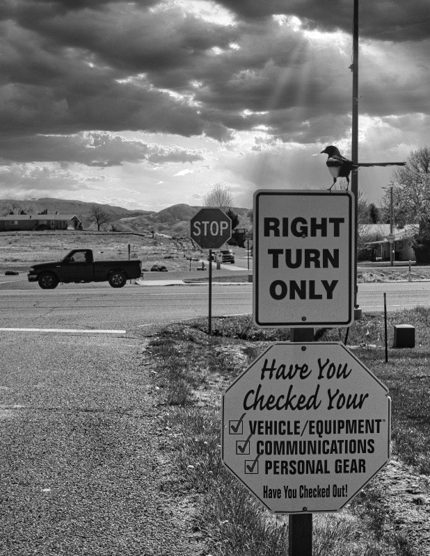 I actually like the irony of the magpie looking left juxtaposed with the "right turn only" sign. The bird, the signs, the truck going the wrong way, the added clouds and sun rays really tell a story. Do you have enough megapixels to crop in on those elements (maybe a vertical crop) to eliminate some of the busy-ness in the frame? Just an idea... |