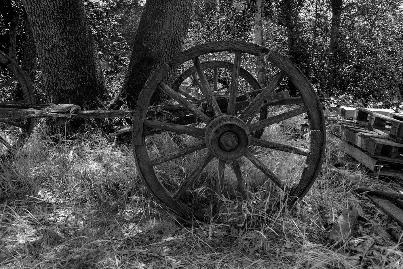 James, I like this shot but I thought I would try converting your uncropped image to BW just to see, because I like the old wheel in context too. Converted in Photoshop adjusting the colour sliders (darker greens, yellows and blues and, surprisingly, lighter magentas) and masking out some of the bright areas at the top of the frame. Not sure what you think - it might be a little dark. |