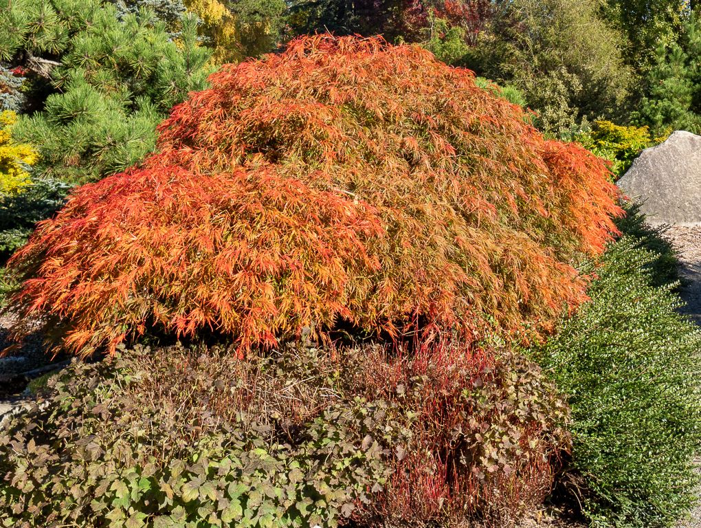 Nice idea for a fish eye. I do have one. Didn't think to use it. Will have to wait until next year now, since the tree has likely dropped all of its leaves. I don't think everyone understands about this tree. it is about 6 feet tall, and it is like an umbrella, the branches come down to the ground. Maybe you can relate to a small weeping willow? I was INSIDE under the branches, shooting up. The sun backlit it. It is a Japanese maple, and so the branches twist. There is no way in that position I could get a photo of the entire tree. Here is an OUTSIDE shot of the tree. |