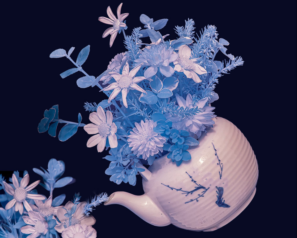 That is an infrared photo of real flowers. I was at a flower show, and simply brought along a black piece of cardboard! Since I posted this, I updated it. I ran it through a blue profile to keep the color, and the black became navy on my screen, but unfortunately I sent in to ddg the one without it. I also have a sprig coming out of the teapot I add in PS. |