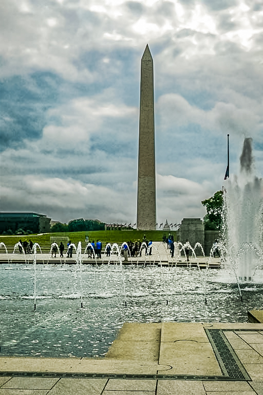 Nice place to shoot the Washington Monument from. If the monument were moved to the left (probably better anyway than in the center) you could have included the whole fountain. Do you have Lightroom? In very little time, this is what I came up with. |