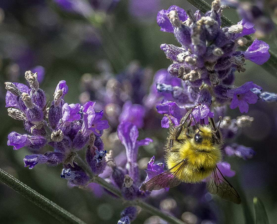 Great Bee. For me, the background is too bright; the first thing I saw was the purple. I toned it down using the color and luminescence rage options in LR, and using the global Luminescence, brightened the yellow. |