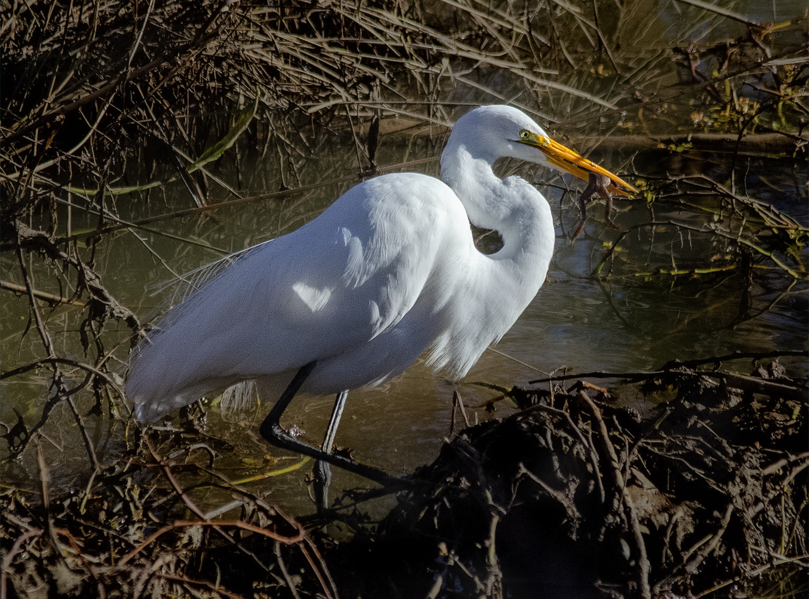 Great egret. Blurring the background is easy in LR -- just select background, lower texture, clairty, contrast. I would clone out the grass over the beak. |