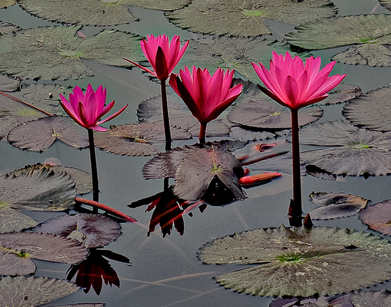 Nice shot. I would consider this crop. Also, increasing the luminence of the middle of the flowers (I used to tool -- I think mostly red luminescence). Also increase texture & clarity of background. |