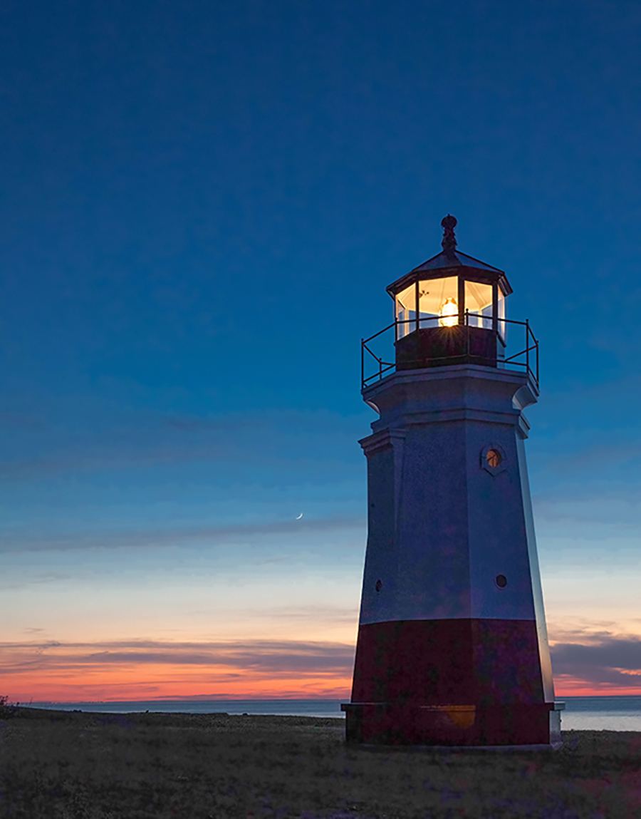 Great shot - wonderful colors and the evening she is very striking with the moon. And then there is the light in the lighthouse - very nice! I see you sued a tripod and with the tremendous exposure difference the lighthouse has to much dark on the bottom for me. Not sure if you can select the lighthouse and bring out some of the detail with the foreground or just crop the bottom.