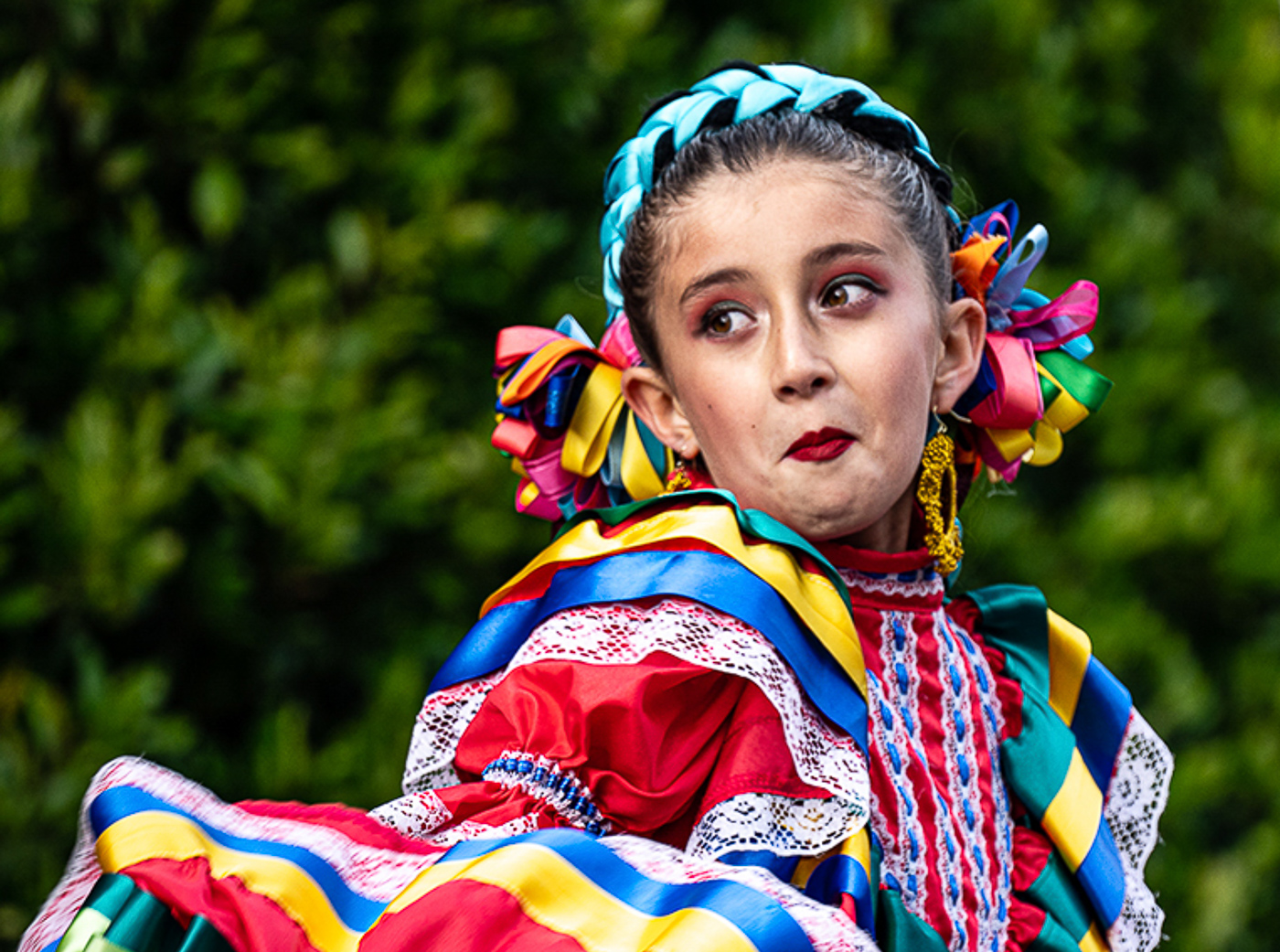 Great subject. Such a happy/bright/colorful image! I'm intrigued by the girl's expression. No clue what's on her mind . . . very whimsical/playful! She pops nicely against the blurred green background. If she was looking directly at you (as opposed out of the frame) - the image would be more compelling; of course you had no control over this model!