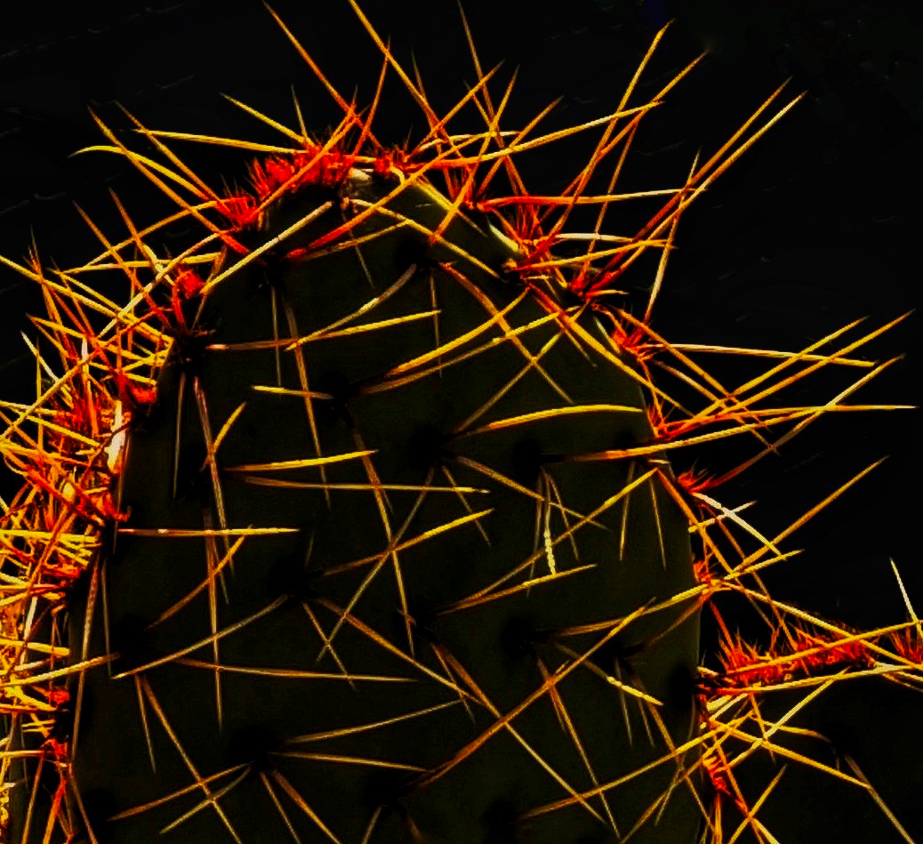 Love this - very creative. Was the orange-red color there - or added in Snapseed? The random/chaotic nature of the spines creates interest. I agree the diagonals in the background are distracting - I was able to remove them (this did require Photoshop). I also like your chosen name of the image! The body of the cactus in shadow - works well with the black background.