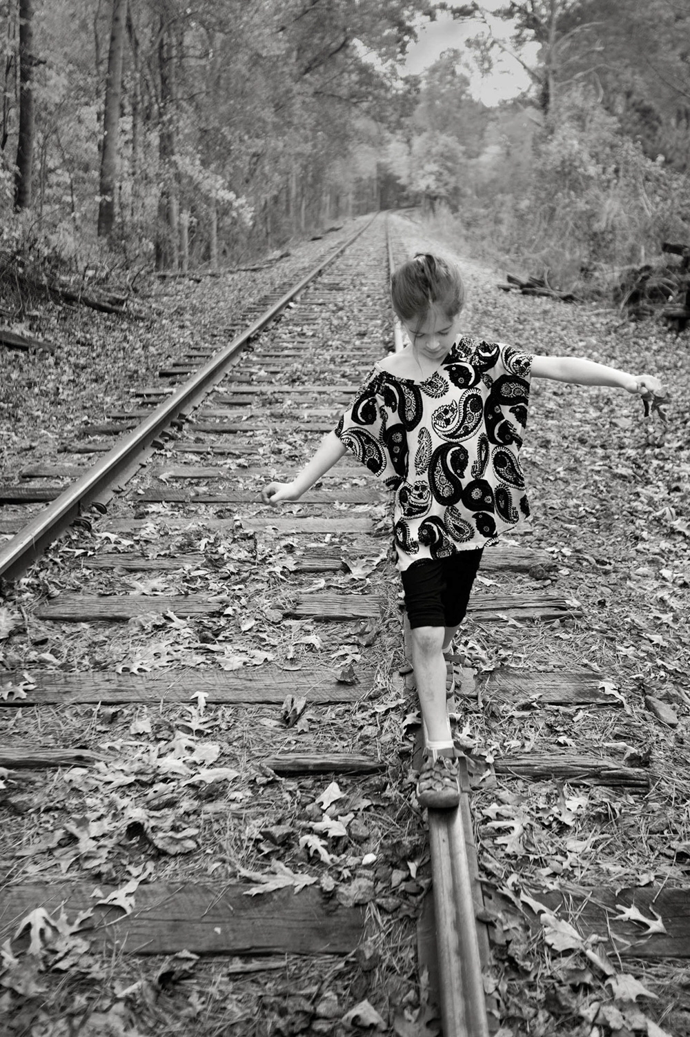 Your family is lucky to have a resident photographer . . . and you are lucky to have a beautiful model! I like the way the tracks lead to Isla - and I can feel a bit unbalanced as I look at her walk along the track. The B&W works well! One suggestion might be to slightly brighten her (a quarter stop) - and use a linear gradient to significantly darken the upper part of the image (example attached). Right now the bright spot above her head pulls my gaze away from her . . . and the bright sky leads me out of the image. |