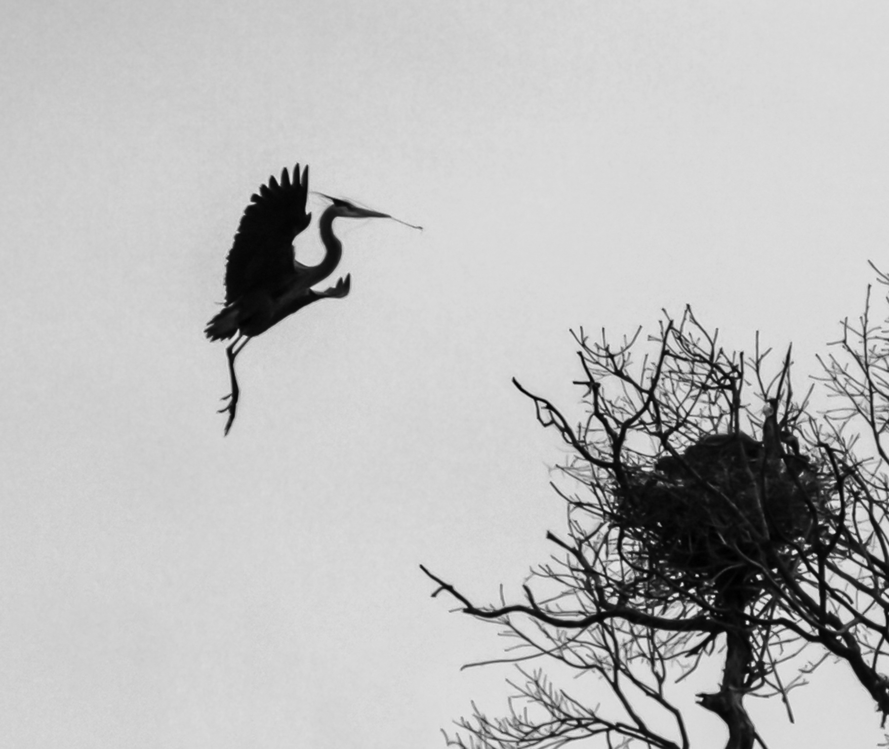 Interesting image - I like that we all know now exactly what this is - despite the almost complete silhouette. Looks like the bird is carrying a branch - that always adds interest. To my eye there is a brownish hue over the image - not sure if that was the scene or something added in your processing. I don't think it helps the image - my preference would be for a cleaner/B&W version (one example attached). Birds in flight are tough to capture - nice job with this one! |
