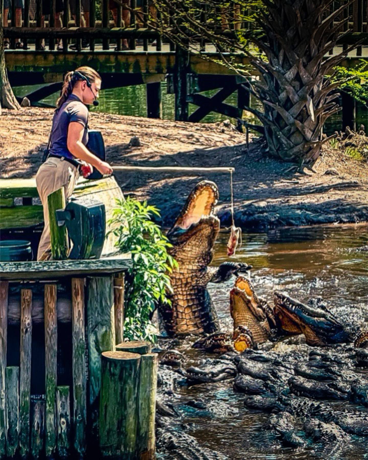 Exciting image - sounds like a place worth visiting! Those alligators sure look hungry. I agree the legs above are a distraction - in part, because they are bright. Can't really crop them out, because you'll be too close to the woman's head. I darkened the upper part, upper right and lower right (see image and illustration of the 3 masks). I might have done too much, but our gaze is drawn to the bright areas - in your image that means away from the subject of interest. |