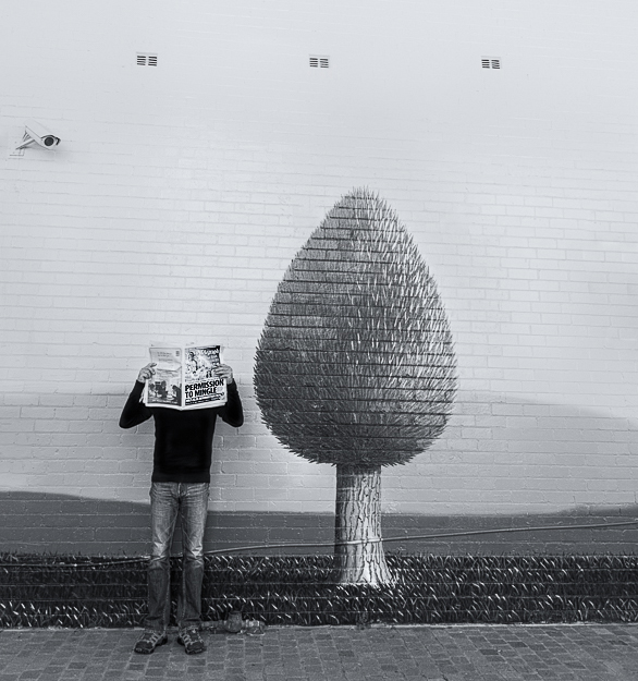 Sharron - great concept and resulting image. I made a couple of modifications: I cropped down from the top as all that white space tended to draw my eye from the main subject. I also selected the newspaper front page and increased contrast to make the headline pop out a bit more. I agree with leaving in the vents, camera, and other "bits". |