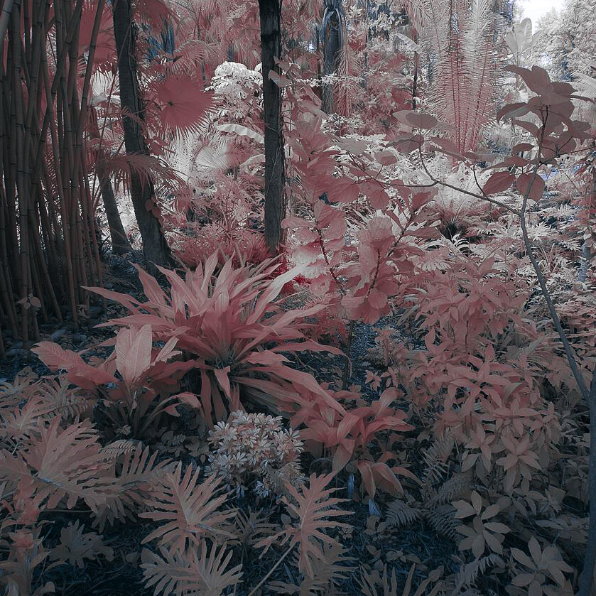Great subject for IR and nice color processing. There were a few things in the composition that bothered me - specifically the leaf coming down from the upper right and the center tree being dead center. I really liked the idea of a square crop, so I zoomed in a bit to get rid of the leaf and move the tree away from the middle of the frame. I also used a curves adjustment to increase contrast. |