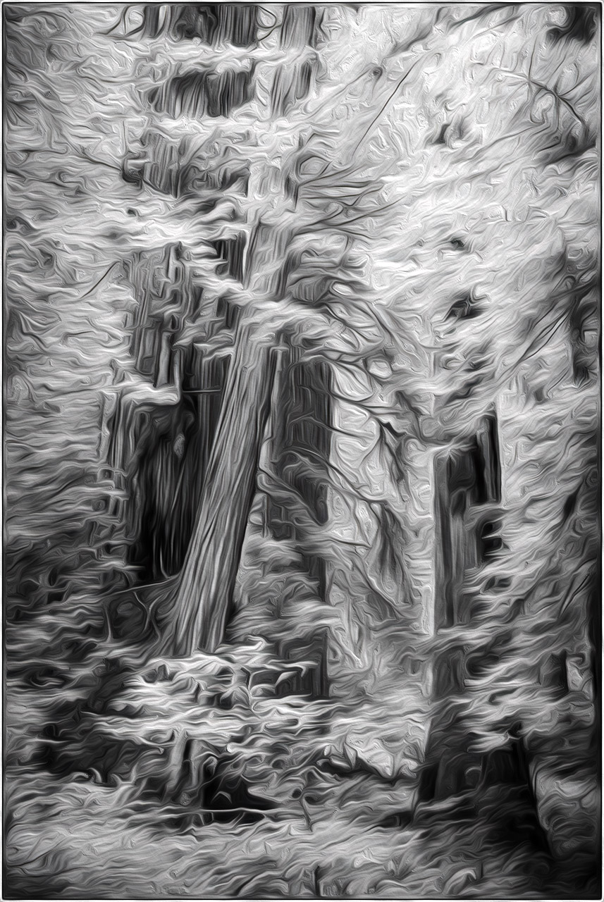 The redwoods are a tough subject under the best of circumstances. I like your composition and I like the lines you created. I agree that the softness of the image is a distraction. You could try running the image through a painterly-type filter to abstract the detail yet preserve the structure of the image. Just for fun, I ran it through Photoshop's Oil Paint filter and upped the contrast quite a bit. I did something similar to an IR photo of a dahlia I created a number of years ago. It ended up winning at a couple of local art shows and I sold a couple of prints. |