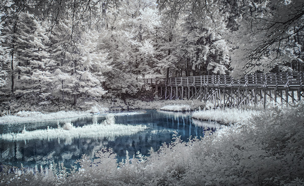 Wonderful scene and perfect for IR. I like where you were going here, but I decided to play with it a bit just to see the possibilities. I converted it to B&W, straightened it slightly (the structure seemed to lean to the left, and did some dodging and burning to direct the eye more down to the distant road. It also deals with the blue sky bleeding onto the tree tips. What do you think? |