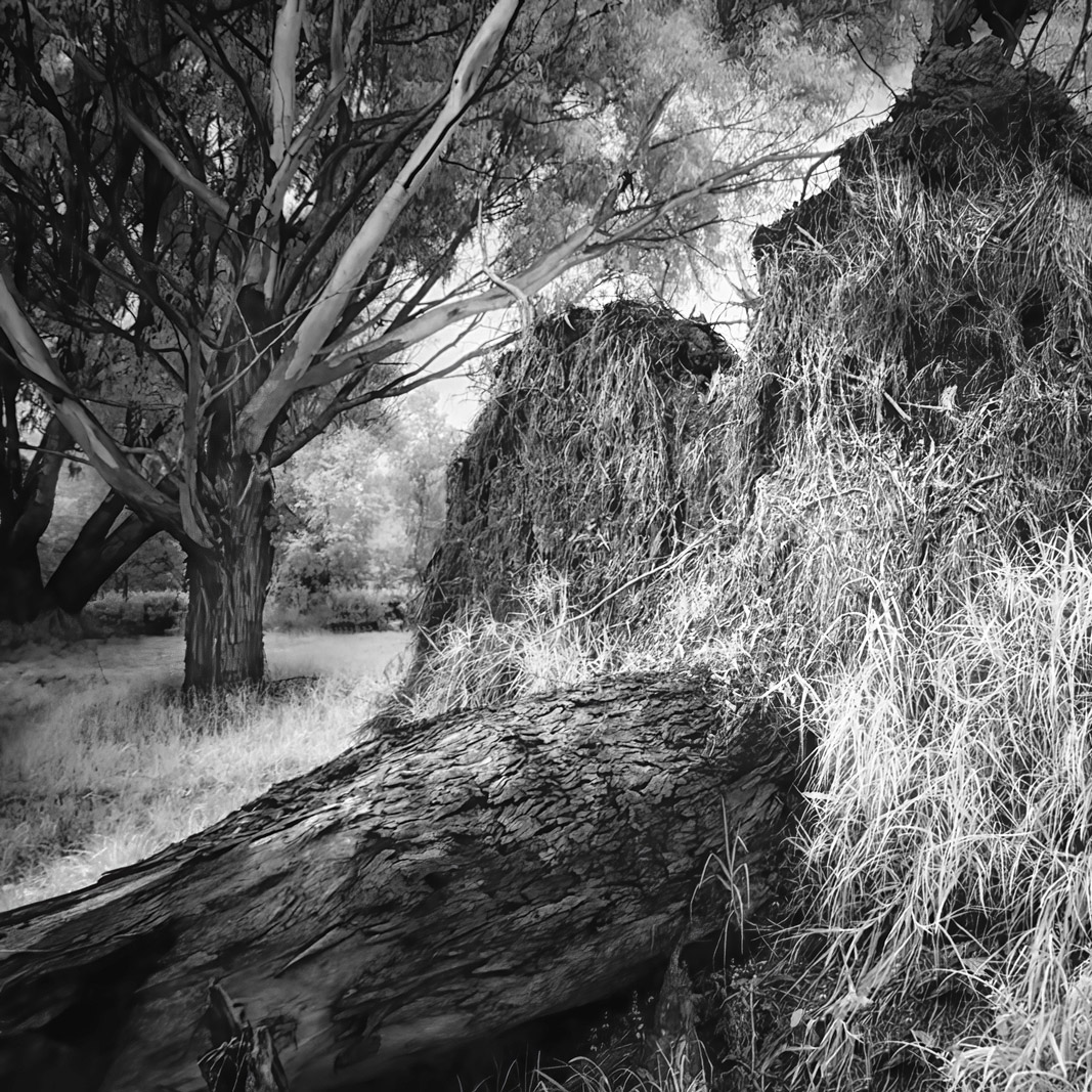 Interesting scene, but my eye kept going to that healthy tree in the upper left corner. My thought was that the overturned tree could act as a frame for the intact one, so I cropped out the rightmost part of the image to create a square frame. I lightened the healthy tree a bit and added a slight vignette to the overall picture. What do you think? |
