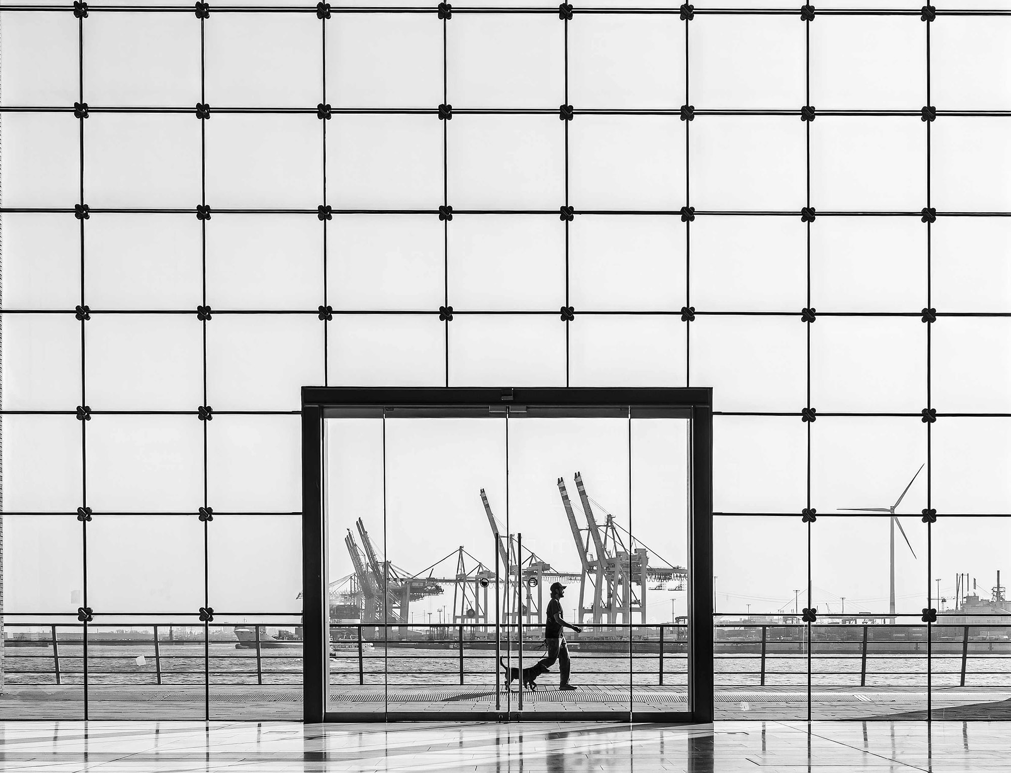I really like this. Your patience paid off as the separation between the man the cranes is nearly perfect. The doorways make a wonderful "picture within a picture". While I do like the side windows, I think cropping them out also works well. See my version. I also cropped down a bit. |